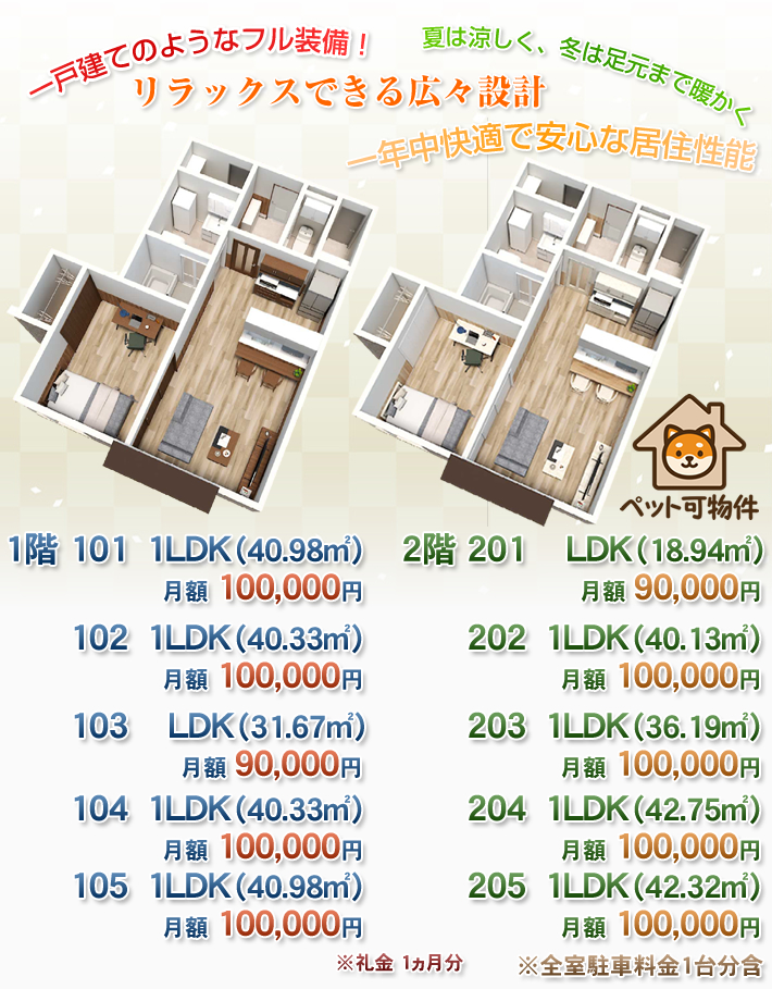大きく開放感のある出窓・ゆとりのある収納・個別屋内倉庫・屋内型共有廊下・高気密高断熱・各戸収納庫付(1.3㎡)・各戸駐車場付